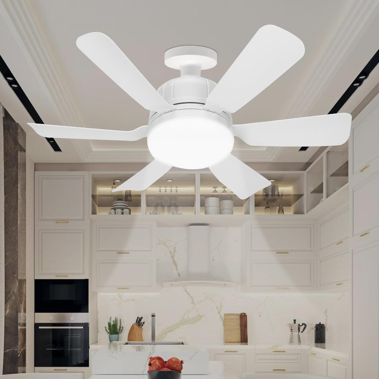 يتميز التصميم الأنيق بمصباح دائري في وسطه، محاط بأربعة شفرات مصممة بأناقة توفر تدفق هواء مثالي. مع تشطيب أبيض محايد، تندمج هذه المروحة السقفية بسلاسة في أنماط داخلية متنوعة، مما يضيف لمسة من الرقي إلى ديكورك.