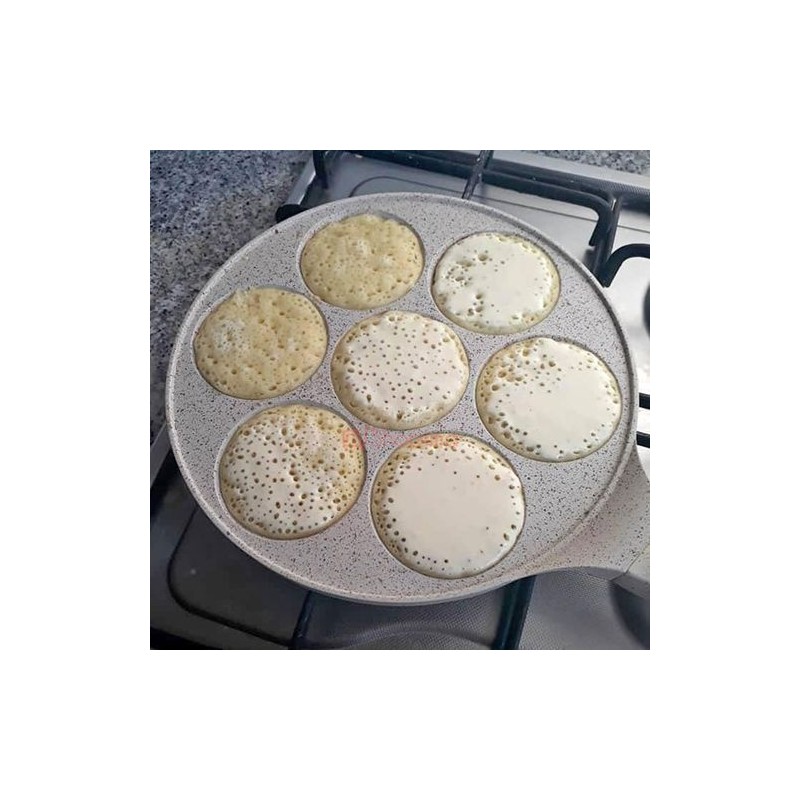 تتميز الأداة بمقلاة مسطحة دائرية مع سبع تجويفات ضحلة، مما يتيح لك طهي عدة بان كيك في وقت واحد. كل تجويف مصمم بحجم مثالي للبن كيك القياسي، مما يضمن طهيًا متساويًا وامتصاصًا مثاليًا للنكهة. مصنوعة من مادة فاتحة اللون، ربما غير لاصقة، تضمن هذه المقلاة سهولة إخراج البان كيك بينما تعزز التسخين المتساوي على السطح.