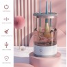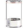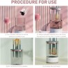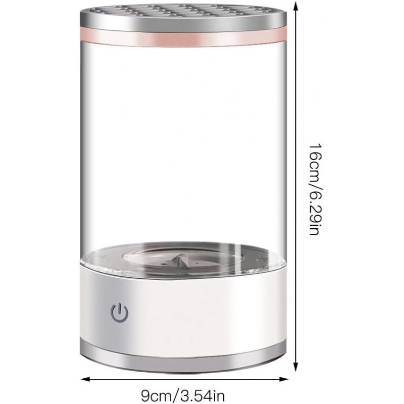 The sleek, cylindrical design features a clear glass container that allows you to watch as your brushes are thoroughly cleaned. With its compact size, this device fits perfectly on any countertop, making it an ideal addition to both professional makeup artists and everyday beauty enthusiasts. The stylish white body accented with metallic rose gold adds a touch of elegance to your vanity.