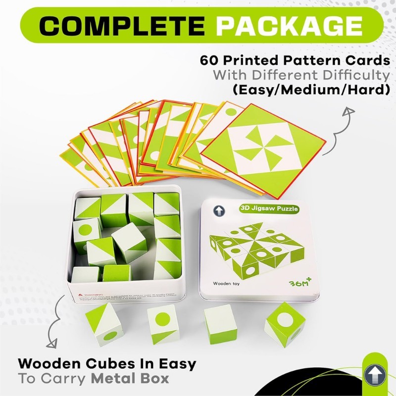 Unleash your creativity and problem-solving skills with our 3D Wooden Jigsaw Puzzle. This complete package comes with 60 printed pattern cards, each offering a unique challenge with easy, medium, and hard difficulty levels. The set includes high-quality wooden cubes stored in a convenient metal box for easy portability. Ideal for both children and adults, this puzzle not only entertains but also enhances cognitive development, spatial awareness, and logical thinking. Whether at home or on the go, enjoy endless hours of educational fun.