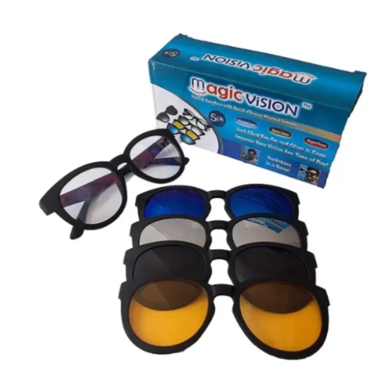 The Magic Vision Multi-Lens Eyewear Set is your ultimate accessory for versatile style and enhanced vision. This set includes a stylish frame with five interchangeable lenses, allowing you to effortlessly switch between different looks and functionalities. Whether you need to block out the sun, reduce glare, or simply want a fashionable touch, these lenses have you covered. Perfectly designed for comfort and durability, this eyewear set is an essential addition to your collection.