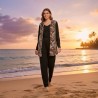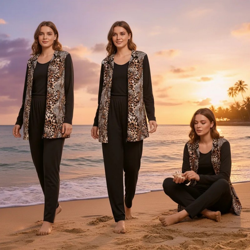 This fashionable cardigan set features a trendy leopard print design, ideal for adding a touch of style to your casual wardrobe. Made with comfortable and breathable fabric, this set is perfect for a day at the beach or a casual evening out.