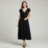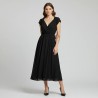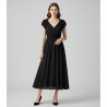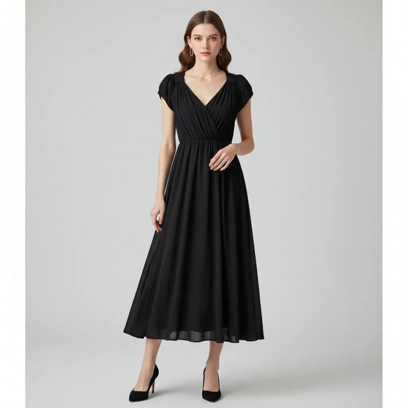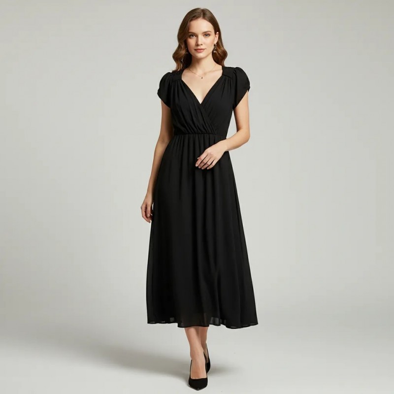 This elegant black midi dress is a must-have for your wardrobe, featuring a flattering V-neckline and cap sleeves that lend a touch of sophistication. Crafted from high-quality fabric, it drapes beautifully, offering both comfort and style. The fitted waist and flowing skirt create a graceful silhouette that is perfect for both day and evening wear. Pair it with your favorite heels and accessories to complete a stunning look.