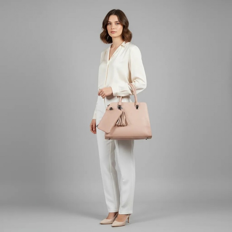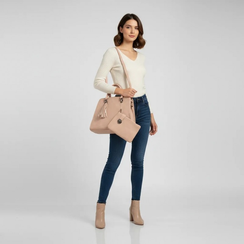 Élevez votre style avec ce sac à main beige sophistiqué, conçu pour la femme moderne. Fabriqué à partir de matériaux de haute qualité, ce sac à main offre à la fois durabilité et élégance. Son intérieur spacieux est parfait pour organiser vos essentiels quotidiens, tandis que la pochette assortie ajoute une touche de polyvalence, idéale pour les courses rapides ou comme une pochette élégante. Avec un détail de pompon chic et des poignées robustes, ce sac à main est votre accessoire incontournable pour toutes les occasions.