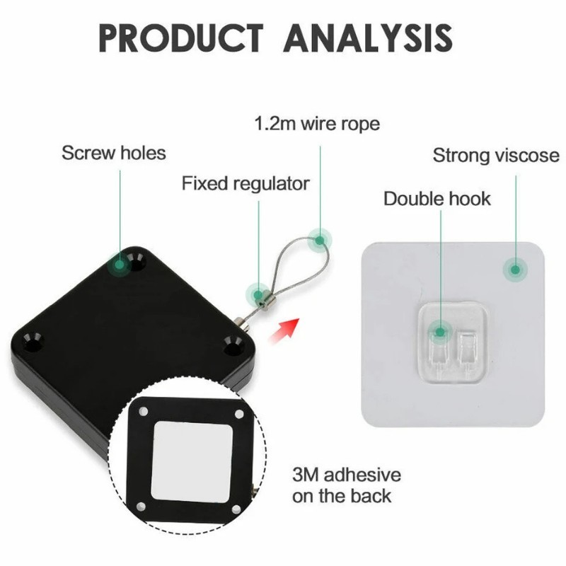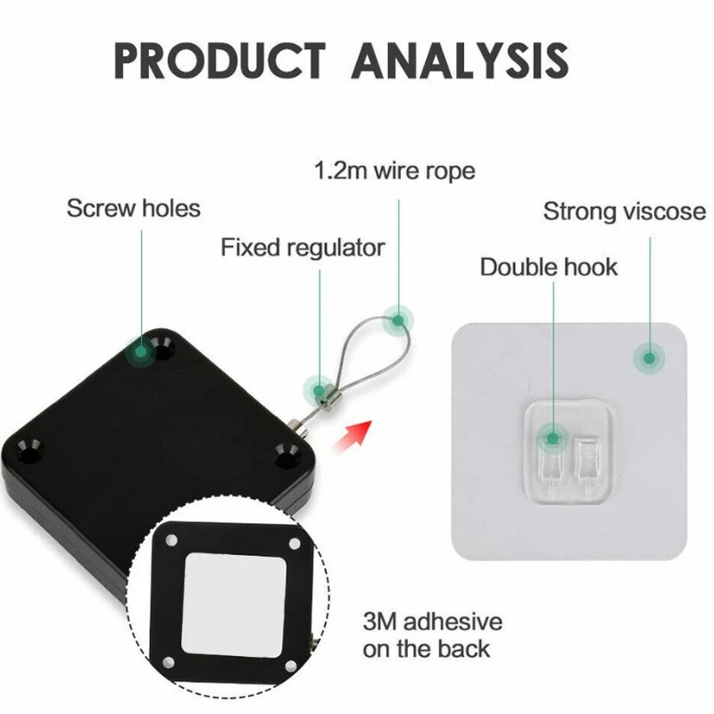 Ce câble métallique rétractable mesure 1,2 m de long, possède un dos adhésif solide et des double crochets pour une installation facile et sécurisée. Idéal pour organiser les espaces ou suspendre des objets en toute sécurité, ce produit est équipé de trous pour vis et d'un régulateur fixe pour plus de stabilité.